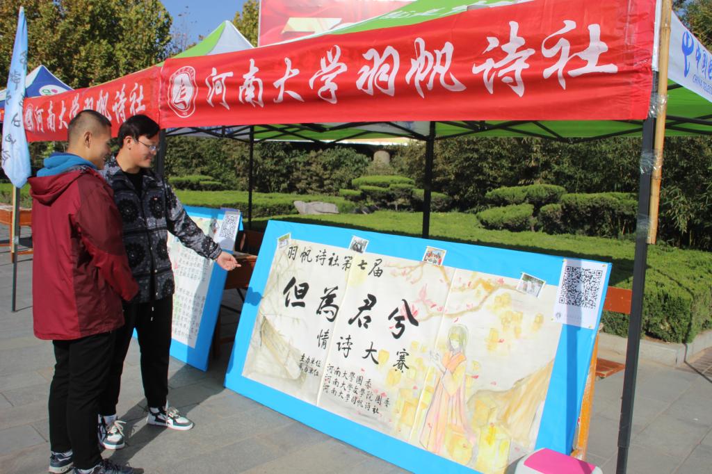 11月11日至13日,文学院羽帆诗社在大礼堂西侧设置摊位,举办“但为君兮”第七届情诗大赛征稿系列活动。