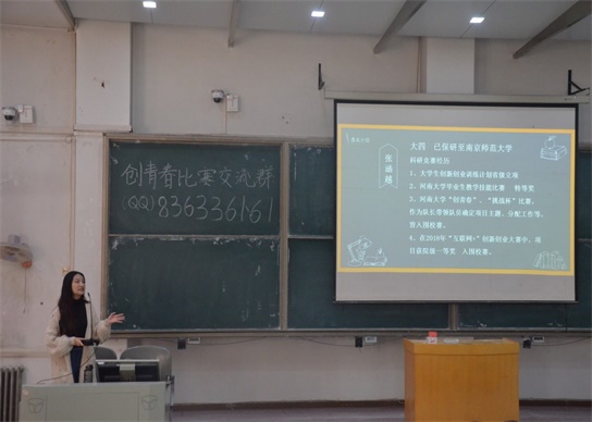为响应教育部“将大学生的创业梦与中国梦有机结合,将激发创业与促进就业有机结合,打造服务大学生创业就业特色阵地”的号召,11月14日下午,教育科学学院在我校金明校区1号楼1201教室举行了以“齐聚学术沙龙,共建创新教科”为主题的学术交流活动,三位具有丰富参赛经验的2016级本科生段雯晖、张涵越、贺雪作为特邀嘉宾出席本次活动,本次“创青春”比赛的所有参赛人员到场学习交流。