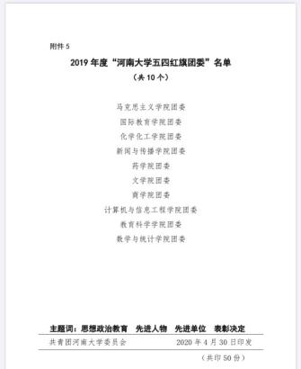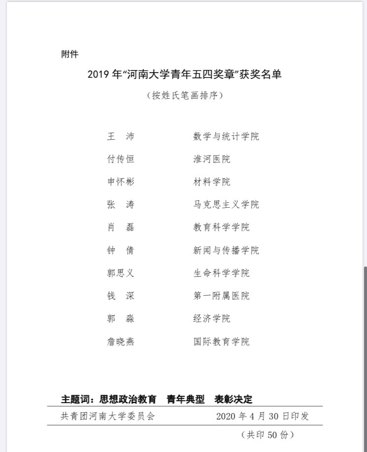 为表彰我校优秀青年、广大团员、团干部和各级团组织在全校各领域内的杰出贡献,激励广大青年及团组织接续奋斗、再创佳绩,在通过学院推荐、共青团河南大学委员会评定后,共青团河南大学委员会于4月30日公布了2019年度五四表彰获奖名单,新闻与传播学院在此次表彰中荣获佳绩。