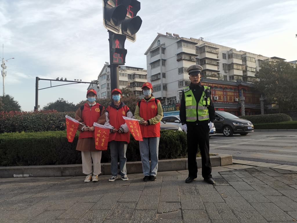 为响应我校党委宣传部号召,助力开封市精神文明建设,进一步发扬“奉献、友爱、互助、进步”的志愿服务精神,展示大学生良好文明形象,药学院青年志愿者于11月2日在河大附中北十字路口开展交通协警志愿活动。