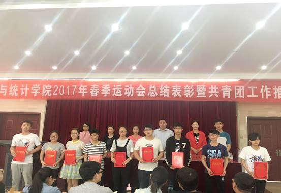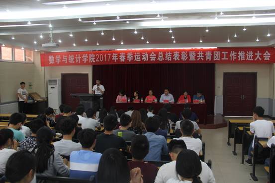 5月11日下午,数学与统计学院在北阶梯教室隆重召开2017年春季运动会总结表彰暨共青团工作推进大会。学院党委副书记王中国、各年级辅导员和学生代表等共100余人参加会议。大会由学院团委副书记吴苏苏主持。