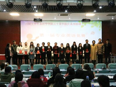 值生命科学学院三十年院庆之际,为提高广大学生学习英语的积极性,展现优秀学子别样风采。12月7日下午,生命科学学院第一届大学生专业英语竞赛在圆形报告厅三楼举行。学院院长万师强、党委书记赵东保、副院长闫文义、安国勇以及党委副书记肖艳等领导班子成员莅临比赛现场。学院400余名研究生及本科生观看了此次比赛。