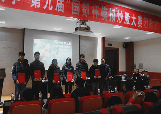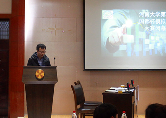 2017年12月14日星期四,由共青团河南大学委员会主办,共青团河南大学经济学院委员会以及河南大学证券研究协会承办的模拟炒股大赛闭幕式在经济学院二阶教室隆重开幕。出席本次闭幕式的有经济学院党委副书记王春晓,开封市国都证券营销部总监杜立磊,经济学院团委老师申永防。在主持人蔡卫帅和张萌的主持下,杜立磊率先为本次活动致辞并表达了对选手们的深切期望。