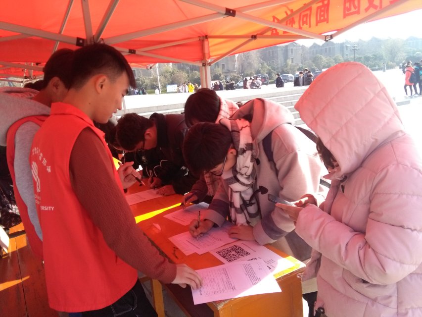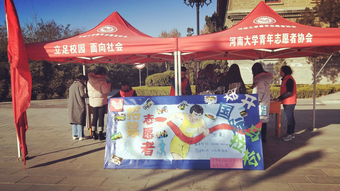2017年12月18日,我校青年志愿者协会在大礼堂西侧设置摊位开始面向全校同学招募2018年国际马拉松志愿者,本次志愿者招募活共持续五天。