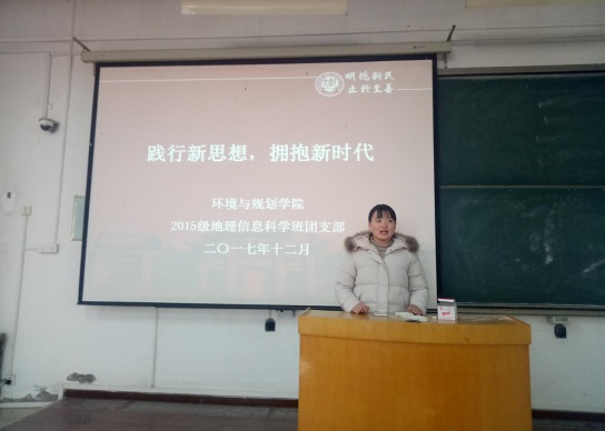 2017年12月21日,环境与规划学院2015级地信班“践行新思想·拥抱新时代”组织生活会在金明综合楼2201教室成功举行。2015级辅导员韩晓静出席本次活动。活动由团支书李倩楠主持。