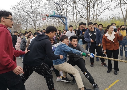 此次趣味运动会分为拔河、共渡难关、定时投篮、跳大绳共计四个项目。大赛在清脆的哨声中拉开帷幕。在拔河比赛环节,同学们个个磨拳擦掌,跃跃欲试,脸上洋溢着骄傲又兴奋的笑容,周围更是围着厚厚的一圈人群,个个探身相望,为即将奋战的同学加油。现场加油声呼喊声此起彼伏,热闹非凡。在共渡难关环节,成员共同配合,协同作战,步调一致冲向终点完成比赛。在定时定点投篮环节,无论男生女生,都为自己专业的集体荣誉奋力拼搏,每当投球者投中一球,四周都是欢呼雀跃的鼓劲儿声,特别是投球命中率高的几个学生,呼喊声从未中断。即使有选手未能投中,四周的同伴也一直为他们加油打气。在跳大绳项目中,选手们都拿出最好的状态,许多团队都破了训练时的记录,着实令人欣喜。这项运动培养的是学生的一种团队精神,一个团队只要精诚合作,默契配合就会无往而不胜。