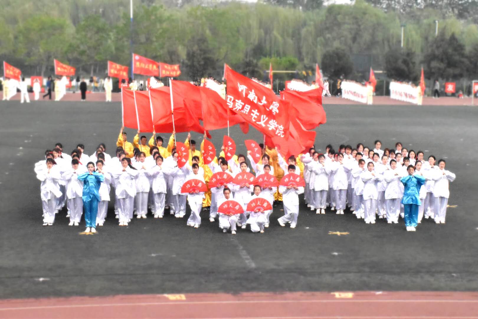茵茵绿场,晴空万里,红旗招展,仙气飘飘。各院代表队整齐有序,依次展示着苦练多日的太极拳成果,场面颇为壮观。开场方式各异,队列形式多样,舞龙、舞剑、舞扇等文艺展示缤彩纷呈,现场喝彩声、鼓掌声此起彼伏,气氛十分热烈。