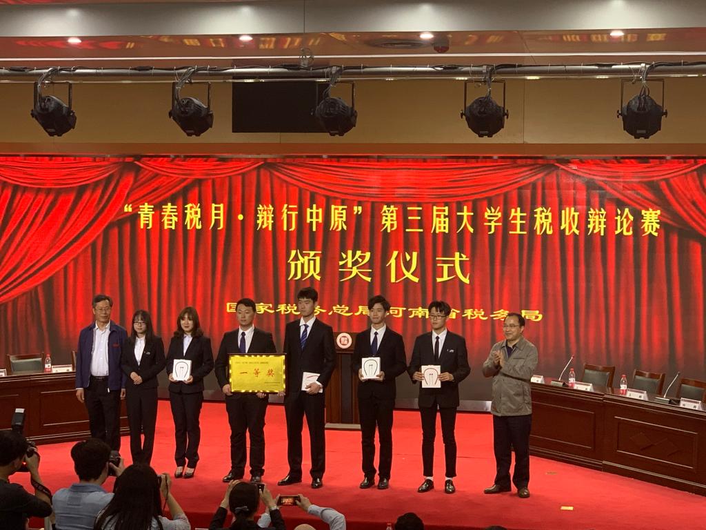 5月9日,由国家税务总局河南省税务局主办的“青春税月·辩行中原”河南省第三届大学生税收辩论赛在河南财经政法大学开赛。本次税收辩论赛由我院学生王以晨、赵晴宇、胡静鑫、姚艺博、徐清源、谭景文等同学组队代表河南大学参赛,参赛队伍还有河南财经政法大学、河南工业大学、河南财政金融学院等代表队。经过激烈角逐,我校代表队获得河南省第三届大学生税收辩论赛冠军,队员王以晨获最佳辩手称号。