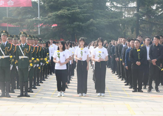 公祭活动尾声,礼兵向烈士纪念碑敬献花篮。活动最后,陈琳和新闻与传播学院学生代表神情肃穆,向革命烈士敬献鲜花,以表追思。