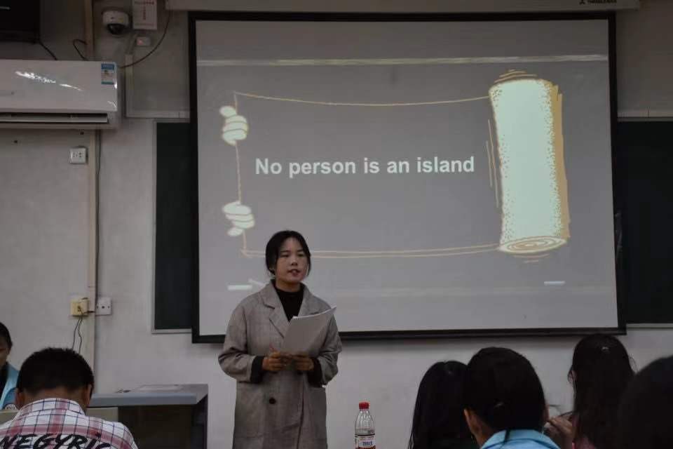 此次演讲比赛以“No person is an island”为主题。在抽签确定演讲顺序后,各参赛选手围绕主题进行演讲。他们精神饱满,语言流畅,从自身的角度出发表达看法和观点,畅所欲言。其中,牟国宇的表现尤为出彩,他以标准的发音、抑扬顿挫的语调、流利的表达在众多学生中脱颖而出,通过与评委观众的互动活跃了现场气氛,突出了演讲主题。选手们激情澎湃、热情横溢的演讲将比赛一点点推向高潮,现场掌声不断,气氛活跃。