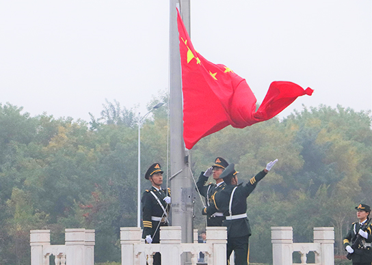 迎着朝阳,国旗护卫队迈着整齐的步伐护送国旗至升旗台。随着雄壮的国歌声响起,擎旗手奋力挥动手臂,鲜艳的五星红旗向天空舒展开来。国旗冉冉升起,飘扬在穹顶之上,全体师生庄严肃穆,用坚定的眼神诉说着对伟大祖国的尊敬与爱意。