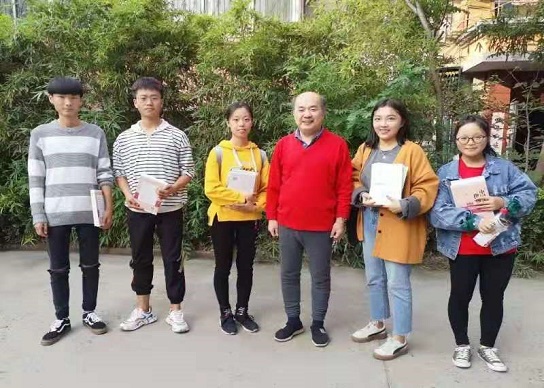 10月13日上午,第二组志愿者们怀着期待的心情来到了白老师的“影视培训基地”。彼时他正伏案写作,面对志愿者们的到来,白老师的热情与开心溢于言表。简单的认识后,志愿者们惊诧于他满桌的书籍。白老师说书籍都是他自己写的,目的是提高学生的语文水平。接着白老师考校起志愿者们来,标点符号怎么用、写作手法是什么,给志愿者们上了一堂别开生面的“语文课”。