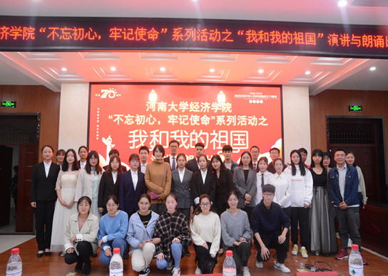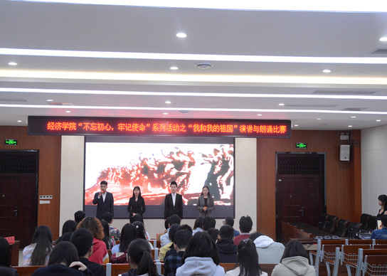 为深入学习贯彻习近平新时代中国特色社会主义思想和党的十九大精神, 10月27日下午7点,经济学院在经济学院第一报告厅举办了“我和我的祖国”演讲与朗诵比赛。本次比赛是经济学院团委“不忘初心、牢记使命”主题教育系列活动的重要组成部分。
