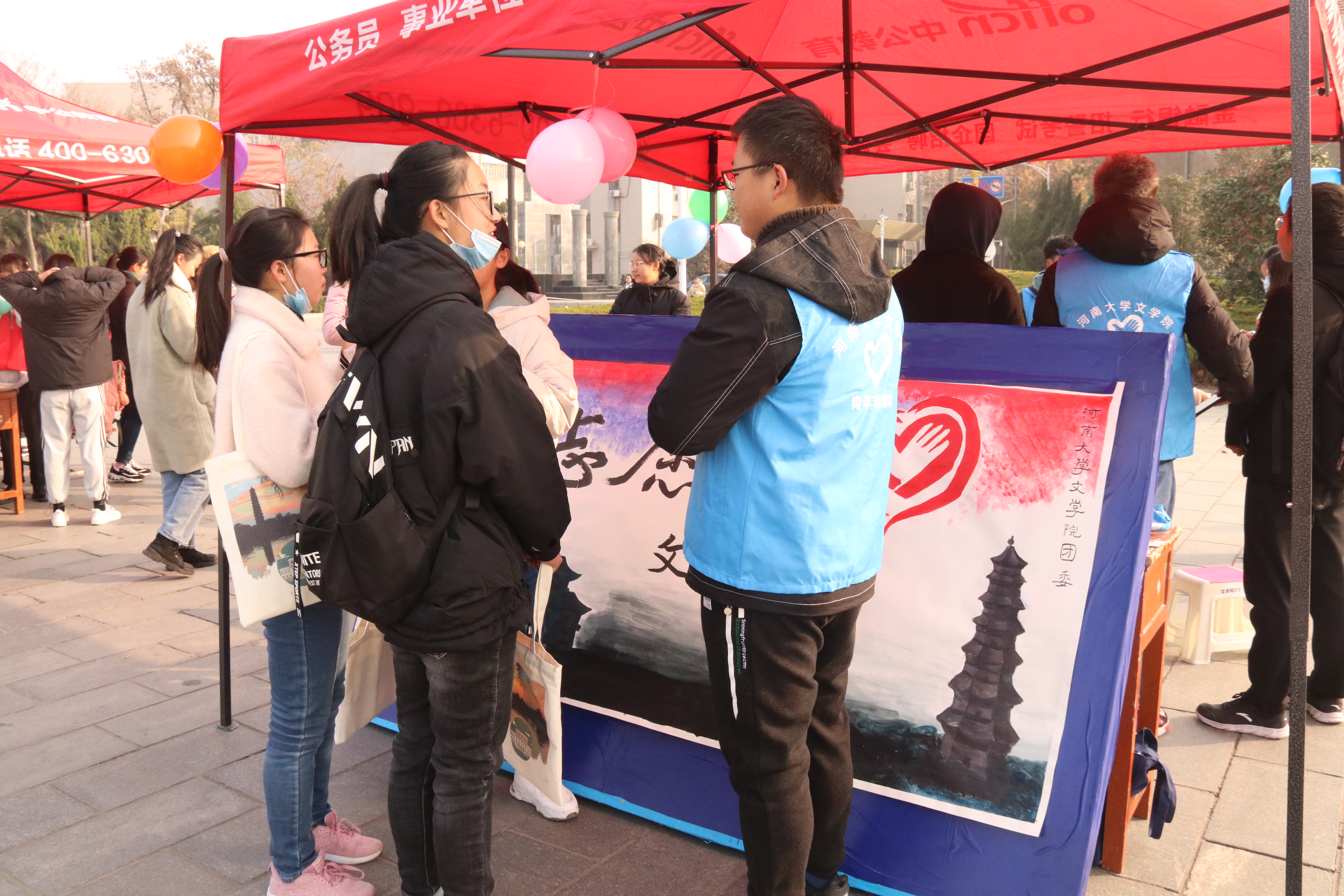 活动开始前,文学院青年志愿者提前来到大礼堂广场布置摊位。他们有条不紊地进行着搭建帐篷、摆放桌椅展板等准备工作,为活动的顺利开展提供有力保障。展板上铁塔与大礼堂的剪影相互映衬,简单却不失意蕴,一颗设计新颖的红心,更突出了本次志愿者文化节“奉献,互助,和谐,友爱”的主题。