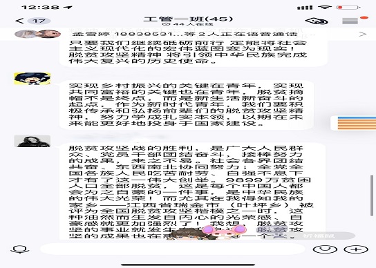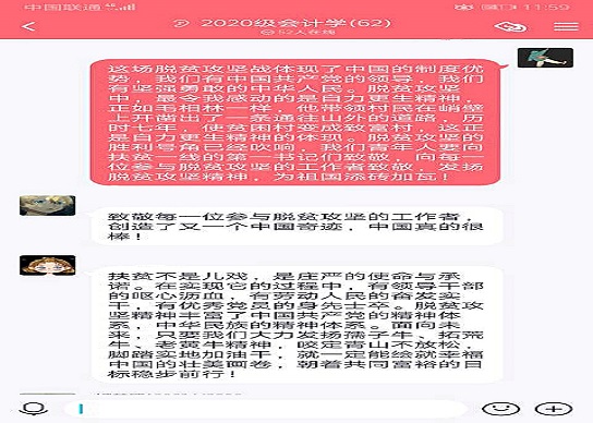 在观看表彰大会时,同学们对荣誉获得者肃然起敬,感受到了在脱贫攻坚伟大胜利的背后,闪动着无数负重前行的身影,传颂着众多催人泪下的故事,纷纷表示要学习他们不忘初心、勇于担当、乐于奉献的精神,做脱贫攻坚精神的传播者。