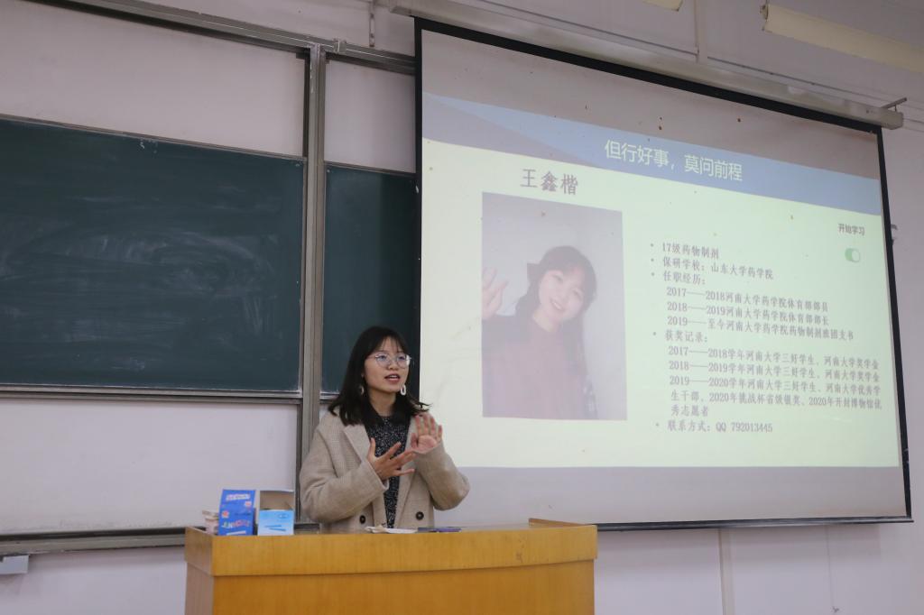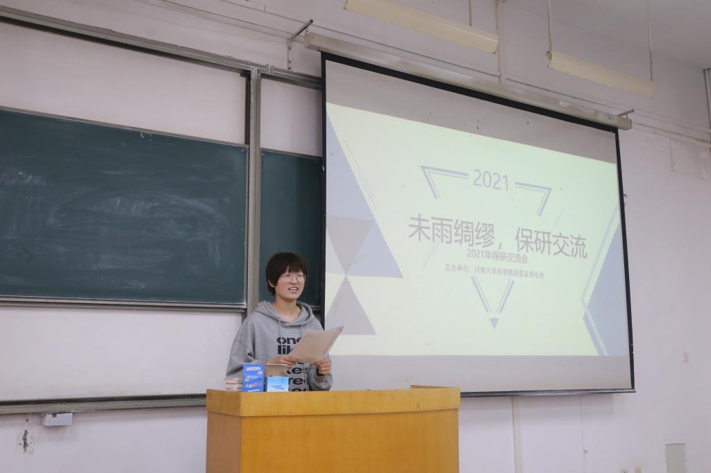 本次保研交流会主要由2021届保研成功的学生上台讲述自己的学习经验,给予想要保研的同学们一些指引和建议。在主持人的介绍下,几位学生依次上台,就保研条件、自身经历、注意事项等方面做出详细说明。首位发言的王鑫楷同学向大家全面地讲述了保研过程中的各种问题,建议想要争取保研机会的同学们准备详尽的个人简历,在关注多方保研信息的同时更要注重平时的学习积累,最后,她用一句“知之为知之,不知为不知”提醒大家脚踏实地,积极求知。保研至中国药科大学的孙小雅同学则着重建议大家丰富经历、提升能力、积极参加比赛,拿出有含金量的获奖证书,展现优秀的自己。此外,在面试过程中要自信大方,发言流畅,给面试老师留下良好印象。在所有同学经验分享完毕后,此次保研交流会圆满结束。