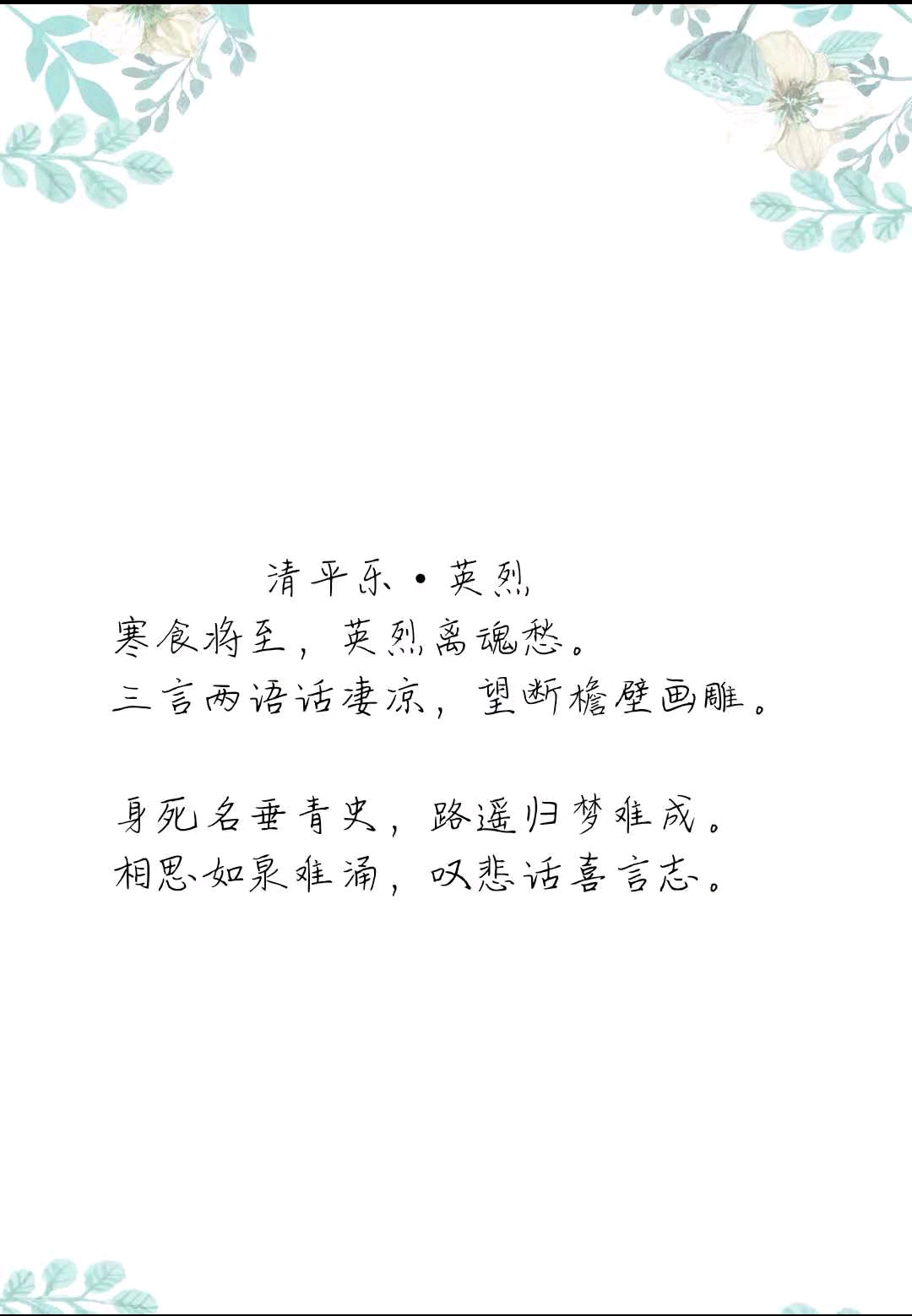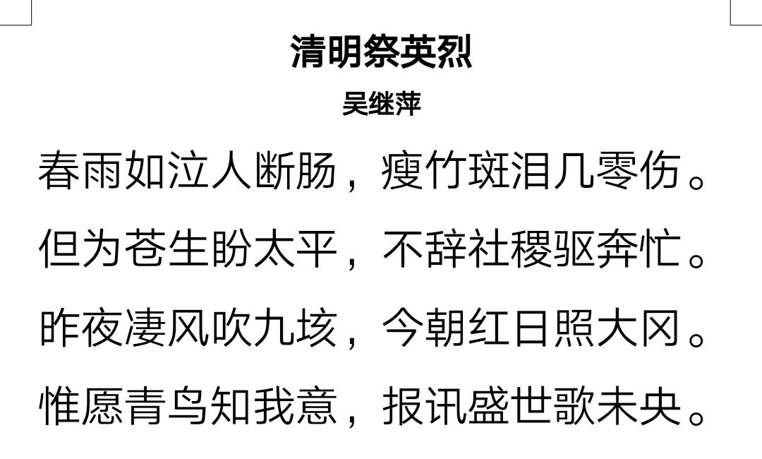 据悉,马克思主义学院积极组织、细心筹备此次活动,采取线上进行的方式,参与者在规定时间内创作清明相关的艺术作品并将所创作内容拍照发送至指定邮箱。同学们踊跃参与,投递作品情感真挚、构思巧妙、创意十足,令人赞不绝口。其中,2020级本科生吴继萍的《清明祭英烈》令人印象深刻,“昨夜凄风吹九垓,今朝红日照大冈。惟愿青鸟知我意,报讯盛世歌未央”这句诗情真意切、动人心弦,让人为之触动。活动结束后,志愿者们统一为参与者发放奖品。